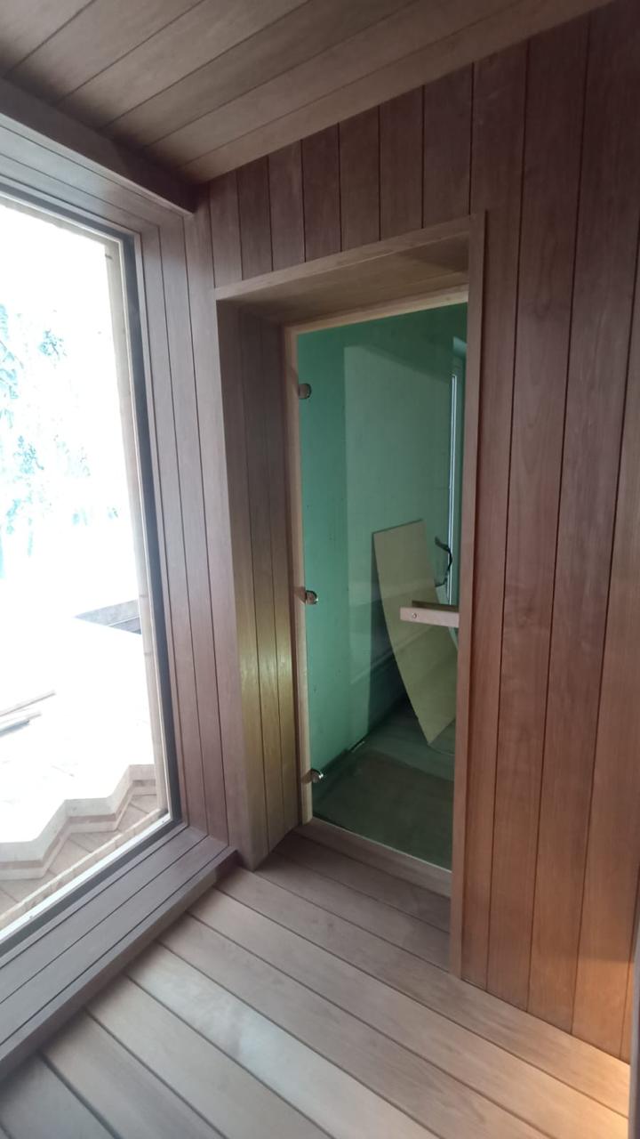 Дверь стеклянная, 8х20 (790х1990 мм), закаленное, бронзовое стекло 8 мм в деревянной коробке из лиственных пород с 3-мя петлями, ручкой и магнитным держателем (Россия)