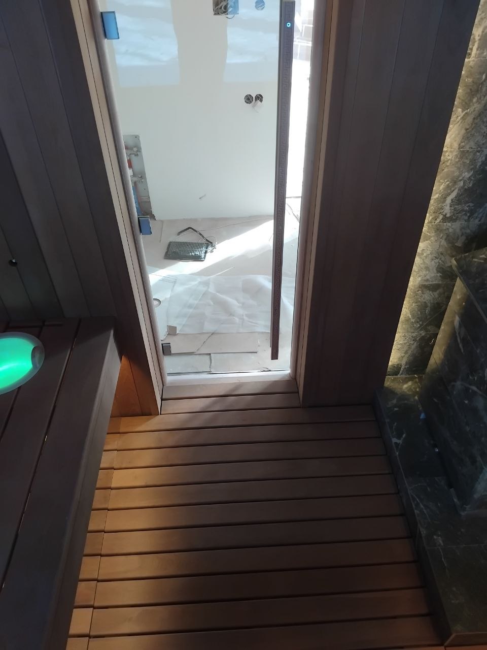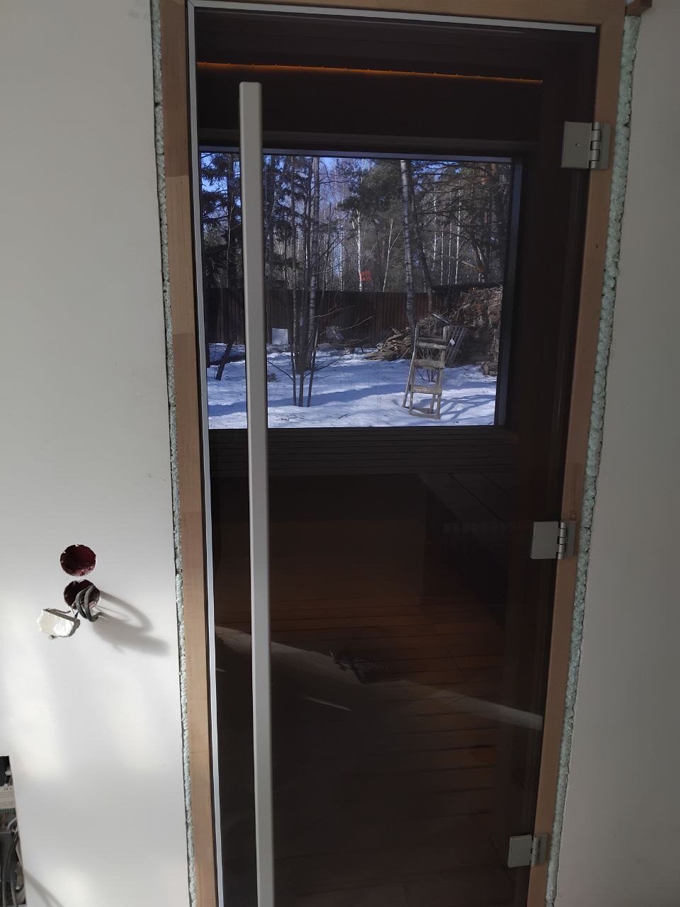 Дверь стеклянная, 7х19 (690х1890 мм), закаленное, бронзовое стекло 8 мм в деревянной коробке из лиственных пород с 3-мя петлями, ручкой и магнитным держателем (Россия)