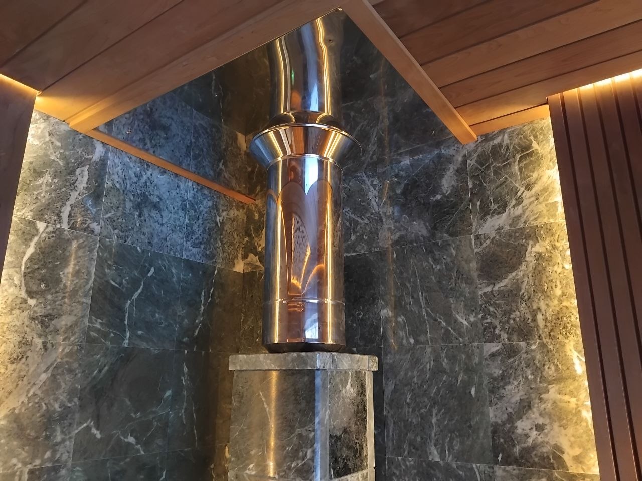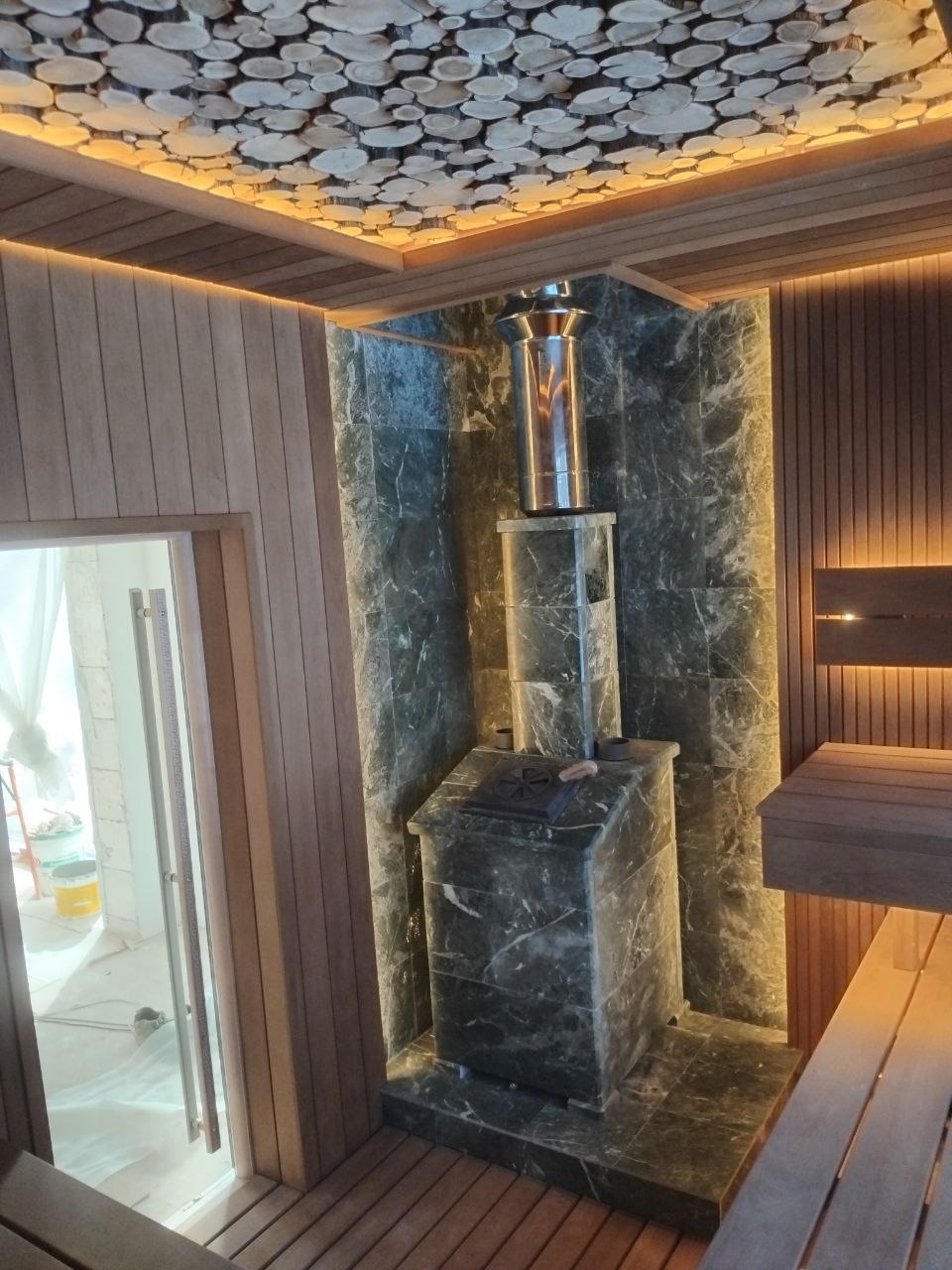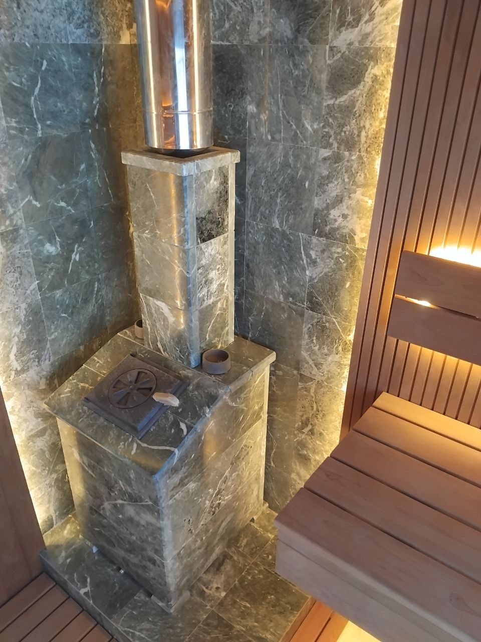 Дровяная печь для бани Гефест (технолит) чугунная в отделке Пироксенит